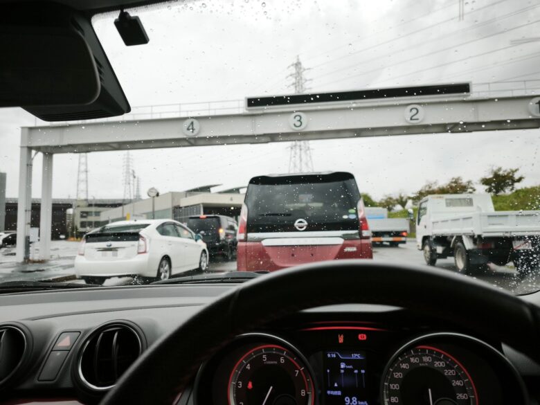検査レーンに並ぶ前にフロントガラスに貼られている車検ステッカーを剥がしておきます。